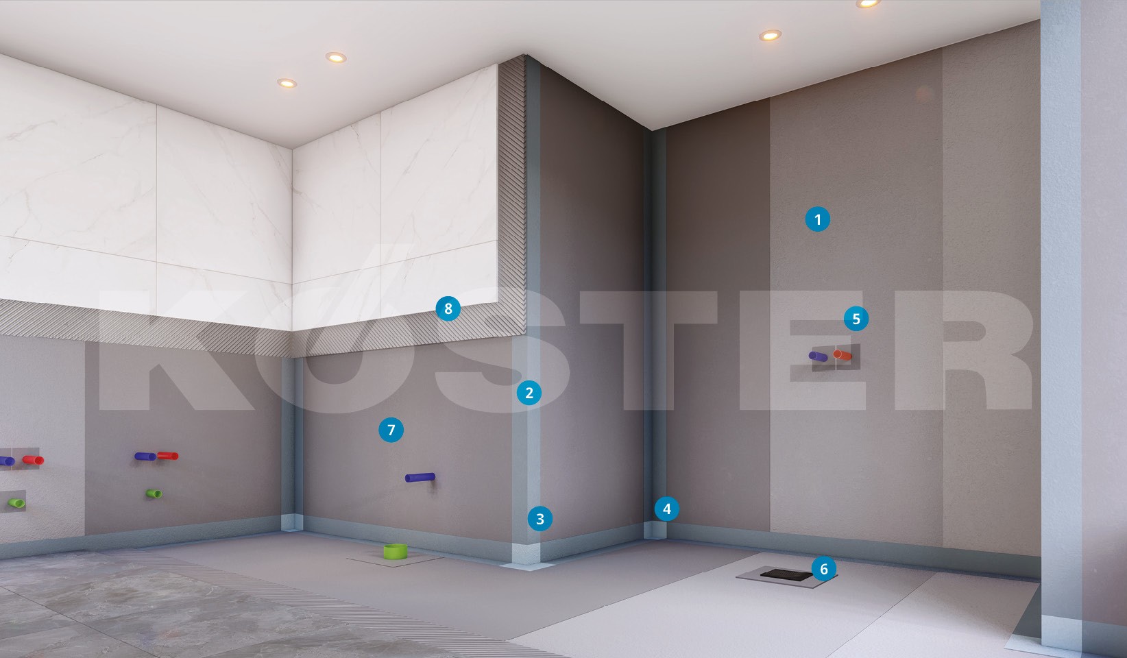 System hydroizolacji KÖSTER BD-System posiada Europejską Aprobatę Techniczną potwierdzającą jego wysoką skuteczność i przydatność jako hydroizolacji pomieszczeń mokrych. System hydroizolacji składa się z preparatu gruntującego KÖSTER BD Voranstrich, który nakładany jest na suche i nośne podłoże. W narożach pomieszczenia i na połączeniach należy zatopić w folii w płynie KÖSTER BD 50 gotowe elementy w postaci narożników wewnętrznych i zewnętrznych, a także mankietów ściennych i podłogowych, które zapewniają szczelność w tych miejscach. Na styku ściany i posadzki należy zatopić w folii w płynie taśmę uszczelniającą KÖSTER Flexband 120/70, która dzięki swej elastyczności przenosi naprężenia powstające na styku dwóch elementów.