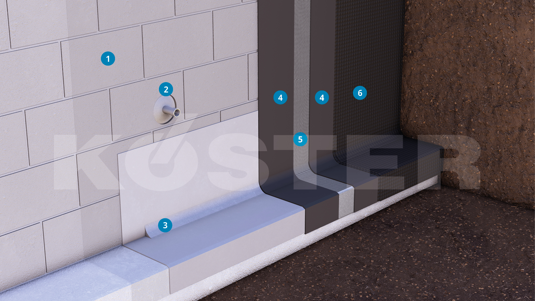 Na połączeniu ściany piwnicy z fundamentem dla zabezpieczenia przed wodą penetrującą od podłoża należy nałożyć warstwę szlamu uszczelniającego KÖSTER NB 1 z dodatkiem emulsji KÖSTER SB-Haftemulsion. Dla zredukowania naprężeń w hydroizolacji na styku ściany z fundamentem wykonywana jest faseta (wyoblenie) z szybkowiążącej, wodoszczelnej zaprawy KÖSTER Sperrmörtel-fix.