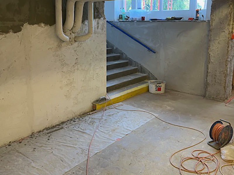 Certain basement rooms in the primary school were to be used as fully-fledged recreation rooms in future, which was not possible due to the damp and salt-contaminated basement walls. For a comprehensive renovation, the first step was to install a retroactive horizontal barrier with KÖSTER Mautrol 2C to prevent further capillary rise of moisture and the salts dissolved in it. The substrate was then prepared with KÖSTER WP Mortar and Polysil TG 500. The interior was waterproofed with KÖSTER NB 1 Grey waterproofing slurry. In the final step, the basement walls sealed in this way were coated with the KÖSTER restoration plaster system. KÖSTER restoration plasters allow the masonry to dry out without damage. They are diffusion-open and have pronounced hydrophobic properties. As the masonry dries, salts that have entered the plaster can crystallise without damaging the plaster or subsequent coats of paint.