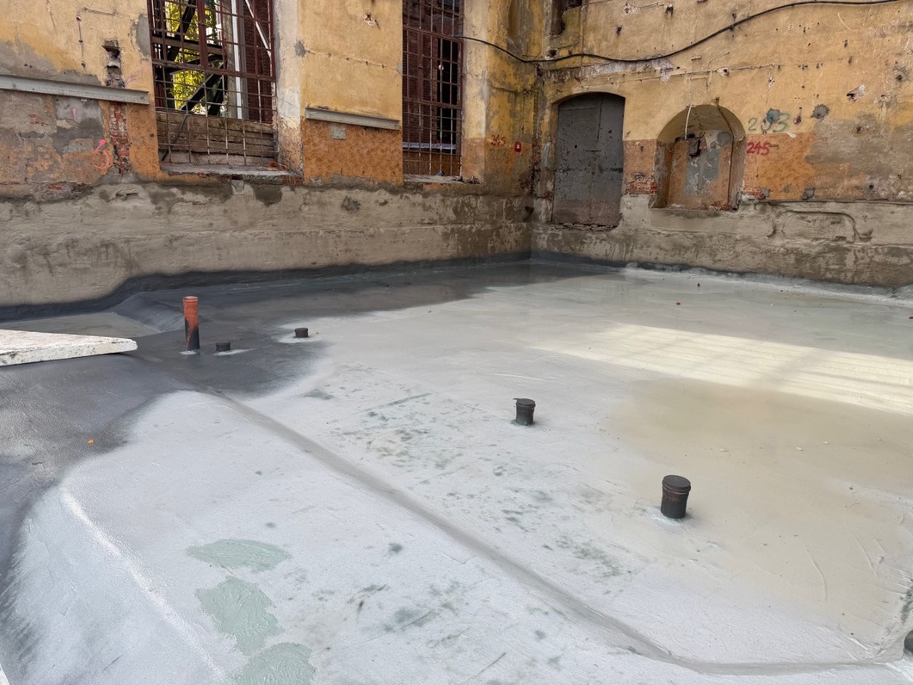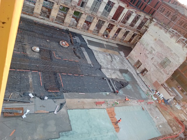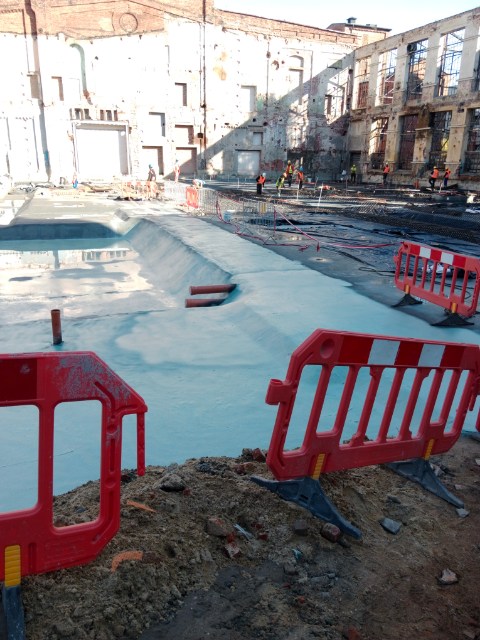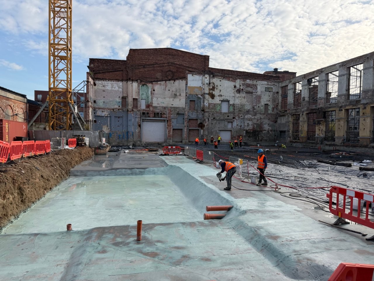 Hydroizolacja KOSTER NB 4000 pod płytą denną i na ścianach historycznych. Łącznie powierzchnia hydroizolacji wyniosła ok. 3000 m2.