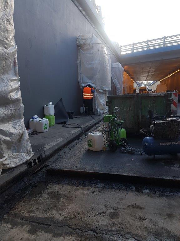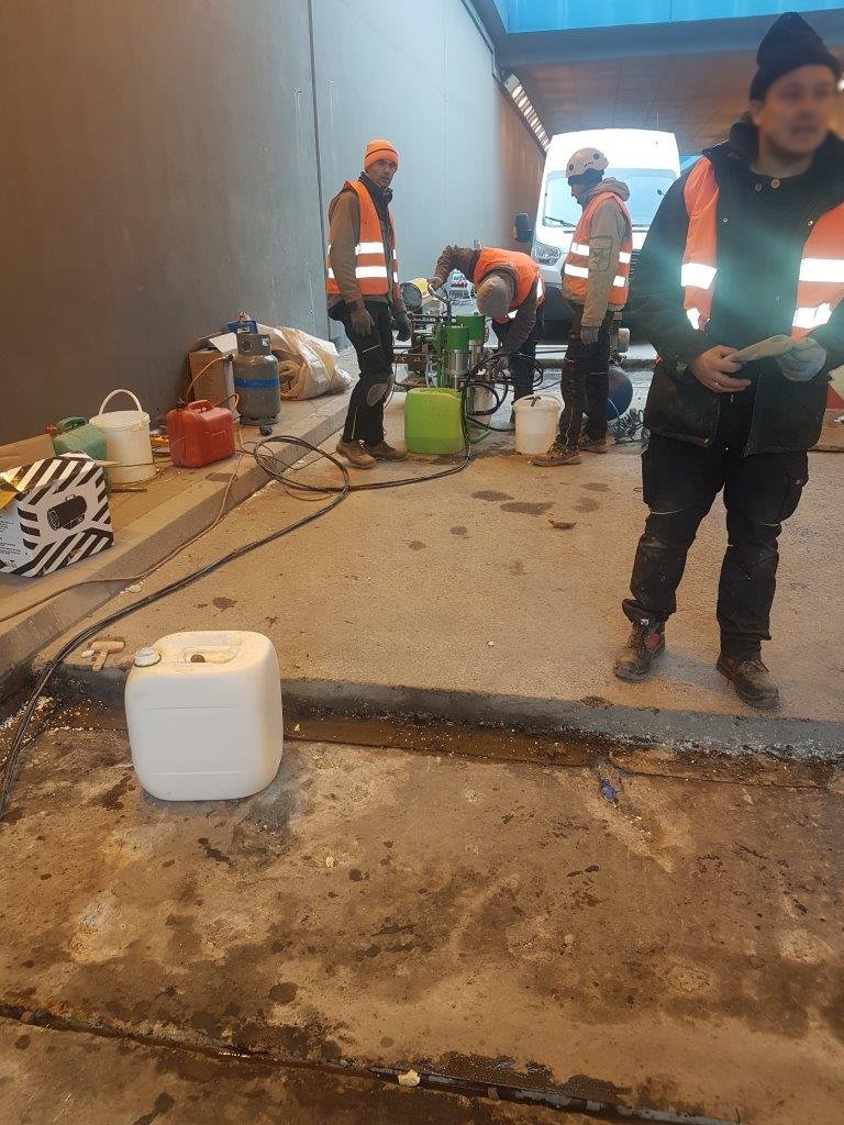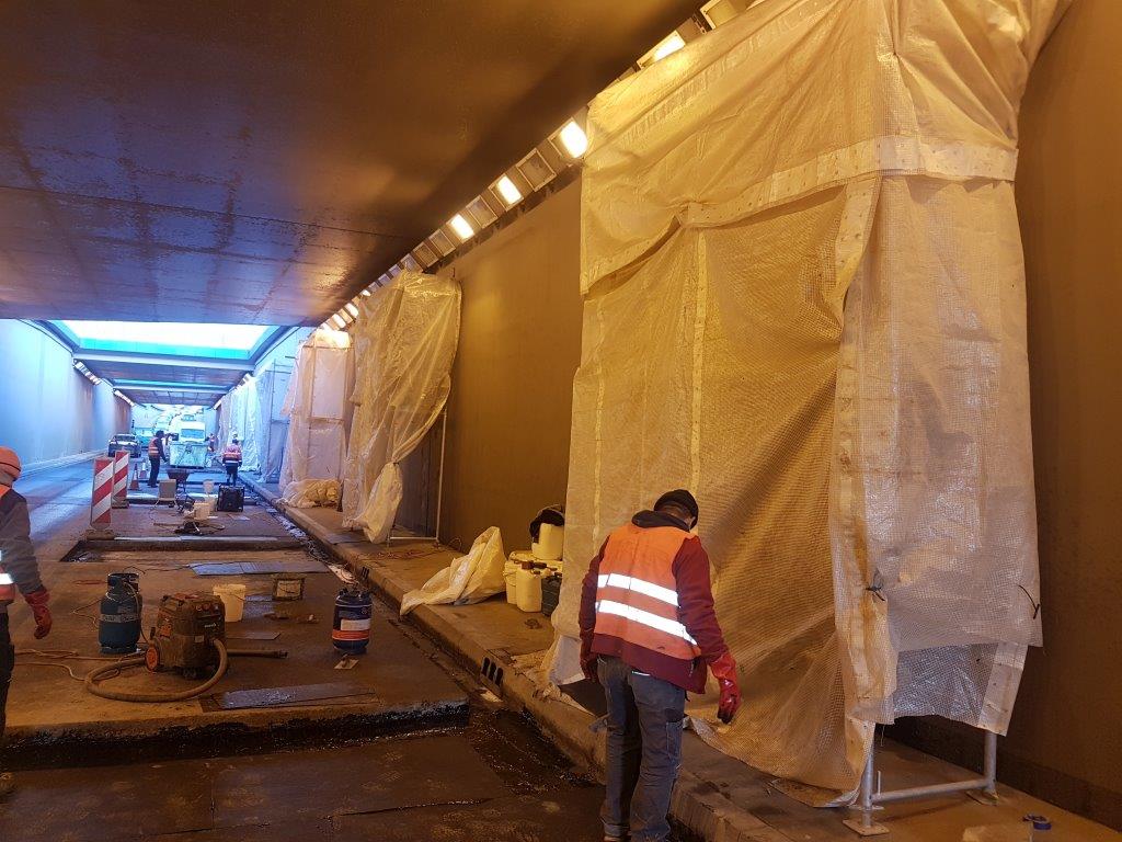 Dylatacje w płycie dennej tunelu oraz w ścianach były nieszczelne. Wykonano iniekcję ciśnieniową żelem akrylowym KOSTER G4 w obszar między taśmami uszczelniającymi. W kolejnym kroku roboczym wypełniono żelem akrylowym KOSTER G4/S4 górnączęść dylatacji. Po zakończeniu prac iniekcyjnych dylatacja została zamknięta przy użuciu dwuskładnikowej masy dylatacyjnej KOSTER Fugenspachtel FS-H. Prace uszczelniające wykonano najpierw na jednej połowie jezdni, a następnie na drugiej.