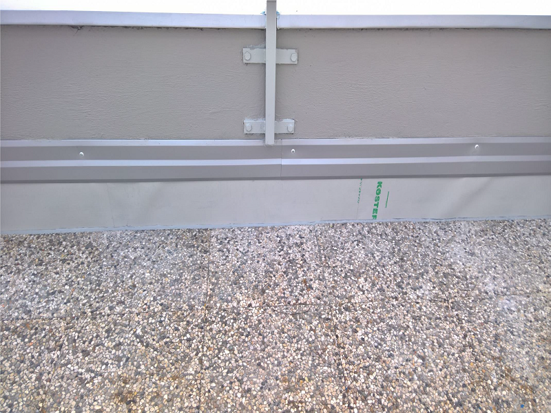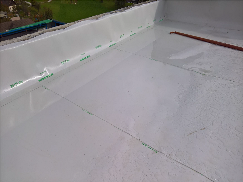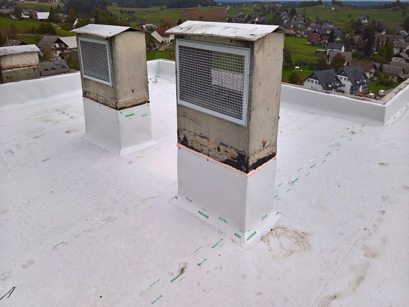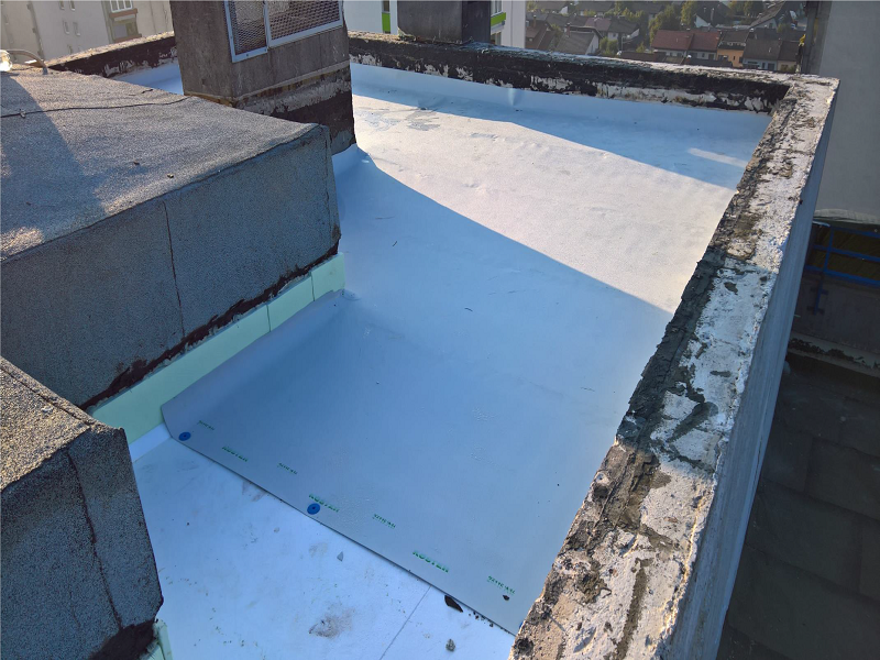 Odstranili so stare plošče in staro dotrajano hidroizolacijo, sanirali betone, odtoke, ... ter nato naredili novo hidroizolacijo s Köster TPO tesnilnimi membranami (način prostega polaganja). Streho so ponovno nasuli in položili plošče.